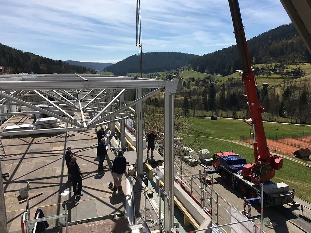 Voor onze montagemedewerkers een prachtig project midden in het Zwarte Woud. Een demontabel project als dit is totaal verschillend van een evenement. We bouwen een gebouw dat twee jaar op een parkeergarage. De parkeergarage wordt ook nog deels ingericht voor de voorraad van het restaurant.